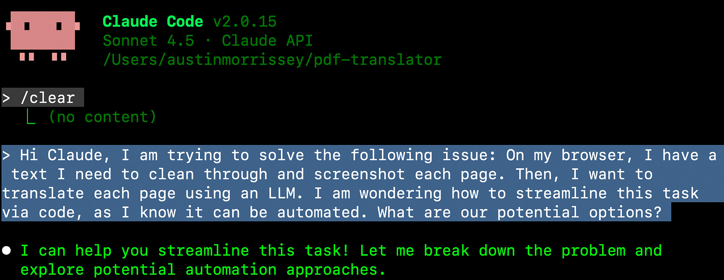 Instead, we’ll use the Python library PyPDF2 to extract the text. Given the same PDF, it’ll produce identical output. Having this intermediate step makes our life easier later on, when we seek to verify translation accuracy. Following the extraction, we’ll have a script divide the corpus into manageable, bite-sized chunks for the LLM. The principle here, again, is to not ask too much at once. If you follow this advice, you avoid much disappointment when working with AI. An LLM will not tell you no. If you provide it the full book and ask for a translation, it will give you one, and it will be bad. Exercise judgment.